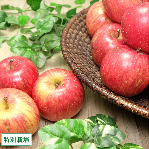 ・化学肥料を使わず、農薬を慣行農法の半分以下に抑えた健康リンゴです。