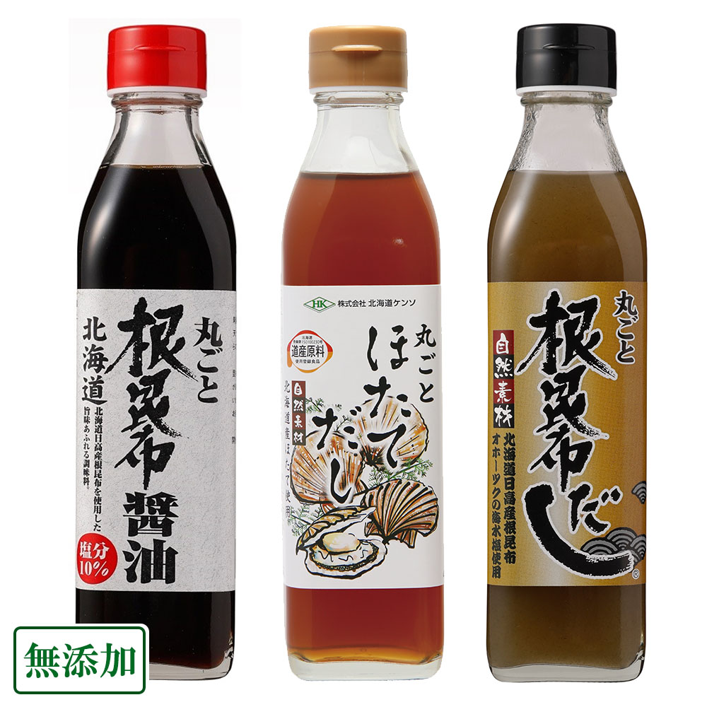 まるごと昆布だし300ml(1本)、まるごと昆布醤油300ml(1本)、丸ごとほたてだし300ml(1本) 合計3本